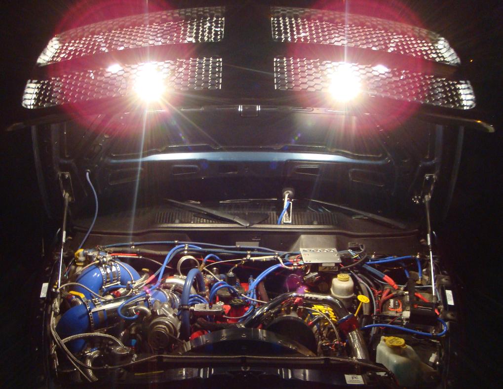 | Stop working in the dark! Show off your "parts" - anytime... anywhere! Powered by the factory wiring harness, Lazar Lites' multiple overhead lamps illuminate the engine bay with up to 3000 shadow-free lumens for high-visibility maintenance or bragging rights on cruise night. Available in DIY Kits or Plug & Play Packages |