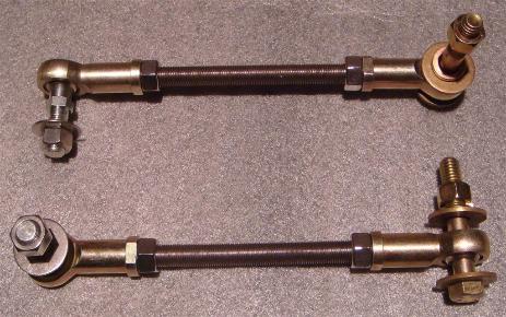| Sway bar end links exceed 15K # load rating each! Designed for abuse with zero-maintenance SS ball. Teflon-lined CrMo heims mount with Gr8 locking hardware to color coated steel axle brackets. Ships with 304 SS studs & locking nuts and HD high-durometer urethane sway bar bushings. Over 1" of length adjustment - also available in custom lengths at no extra charge. |